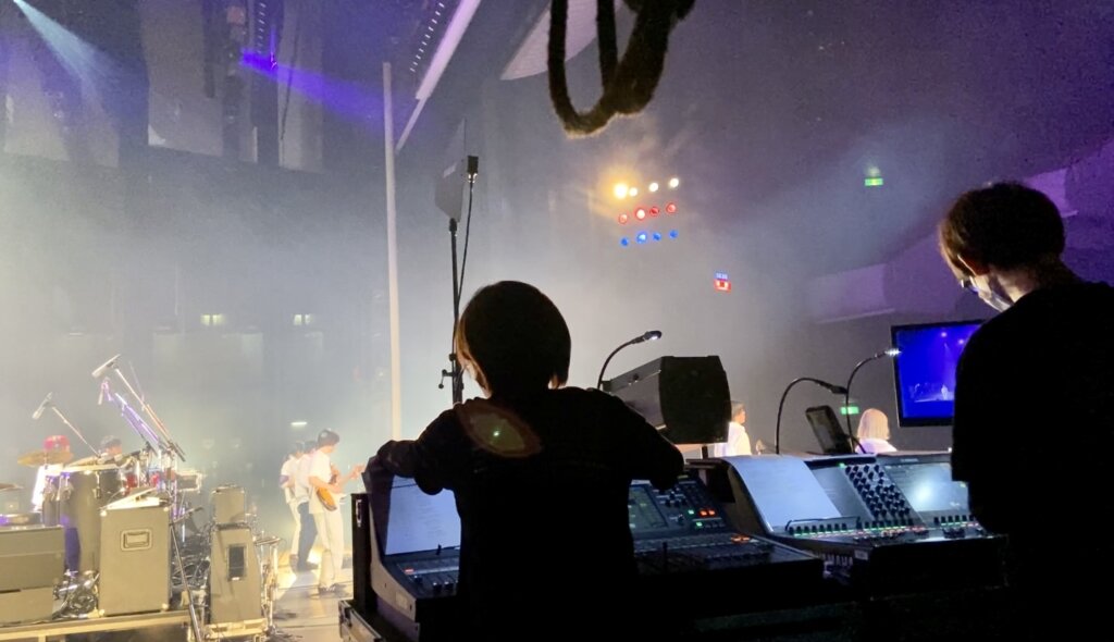 PAチームから送られる配信用音声をバックアップレコーディングしつつ、良いバランスに現場で整えて、映像チームに音声を送っています!